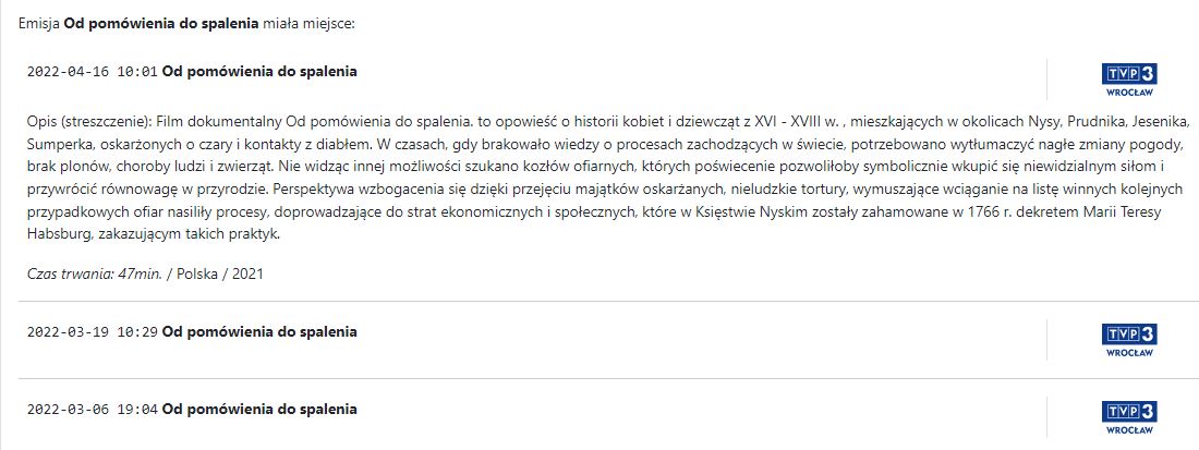 - w TVP Wrocław – Od pomówienia do spalenia (6 marca, powtórki – 19 marca i 16 kwietnia),